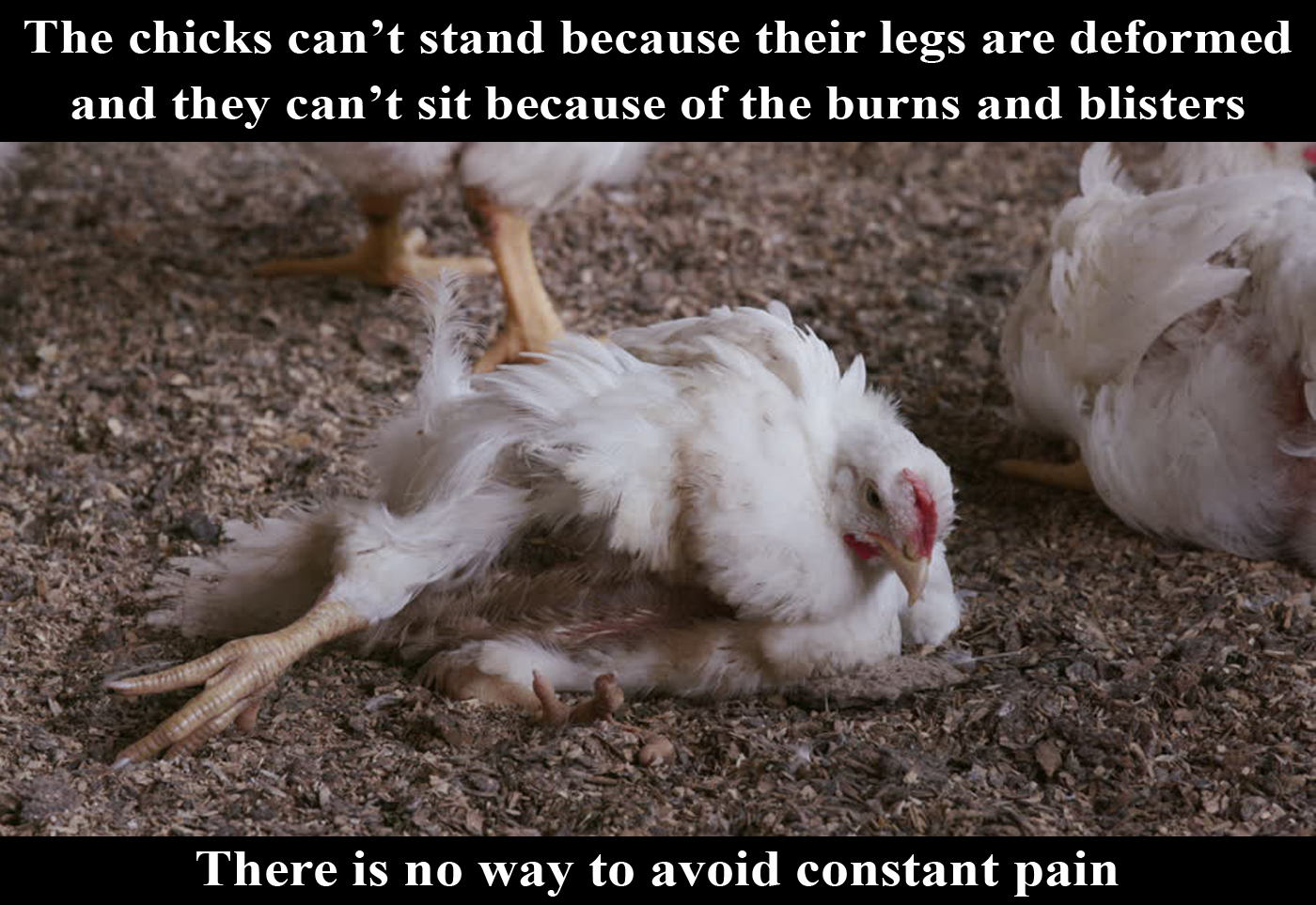 The unnatural growth rate of chickens combined with the lack of space to move or exercise, force the birds to rest on the wet, dirty, ammonia-ridden litter. This leads to painful breast blisters and hock burns. Foot and breast lesions and ulcerations are also frequent.