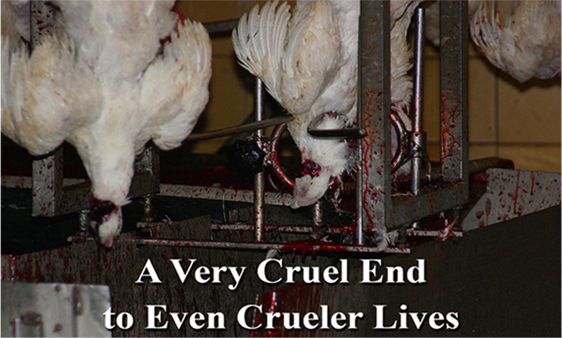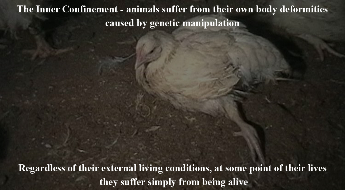 Humans severely cripple billions of sentient beings every year for the sake of maximum flesh in minimum time. Today’s meat chickens have been genetically altered to grow three times faster and three times larger than their ancestors. Pushed beyond their biological limits hundreds of millions don’t even reach 6 weeks of age which is when the whole flock is slaughtered.