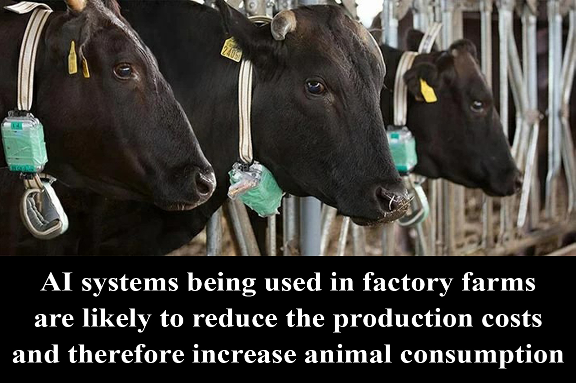 Although there is some potential for suffering reduction due to AI use, for example by using AI systems to screen chemicals for toxicity instead of humans exploiting nonhumans in painful experiments, AI systems that are being commonly used in factory farms are most likely to reduce the production costs of factory farming, and therefore increase animal consumption and by that increase suffering.