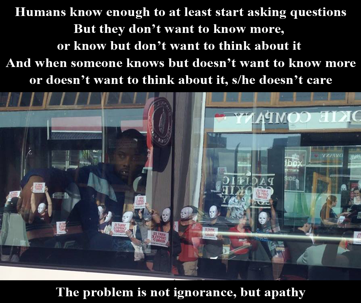 Humans know enough to at least start asking questions. But they don’t want to know more, or know but don’t want to think about it. And when someone knows but doesn’t want to know more or doesn’t want to think about it, s/he doesn’t care. The problem is not ignorance, but apathy.