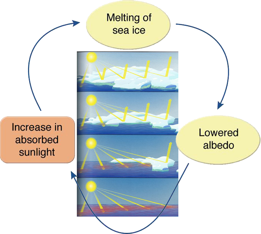 Scattering highly absorptive aerosols, especially black carbon, over snow and ice covered surfaces which are the most reflective areas on earth, would cause a significant reduction in the albedo leading to a faster melting and so a further reduction in the albedo and global warming enhancement.