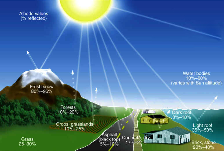In general, every surface on earth absorbs and reflects energy at varying degrees, based on its color and texture. A perfectly black surface has an albedo of 0 (all radiation is absorbed). A perfectly white surface has an albedo of 1.0 (all radiation is reflected). On a smaller scale, albedo can be understood from a personal perspective since you’ve all probably worn a black shirt on a sunny day and felt how it warmed you faster than when you wore a white one. This occurs because black has a lower albedo than white, so it absorbs more radiation and gets hotter.