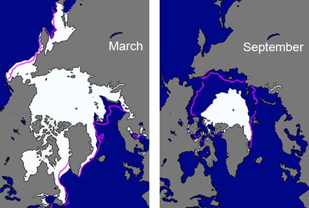 Typically, the Arctic sea ice reaches its maximum extent in March (end of winter) and its minimum extent in September (end of summer). Satellite records (from 1979 till present) show a decrease trend of 4% per decade for the winter ice extent (maximum) and 11.5% for the summer ice extent (minimum). September 2012 had the lowest sea ice extent observed since satellite record and was 49% below the 1979-2000 average minimum. In fact 2007-2013 have been the seven lowest years of minimum extents since satellite record. Overall, in 2012, 11.83 million km2 of ice were lost between the maximum and minimum extents, more than the area of the Unite States. This is the largest seasonal decline in records and 1 million km2 more than in any previous year ’s seasonal decline.