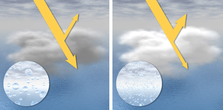- The clouds look brighter, since the sa me amount of water vapor is now divided to more droplets creating more surface area that can reflect light, so they reflect more of the incoming radiation back to space, increasing the cloud’s albedo.