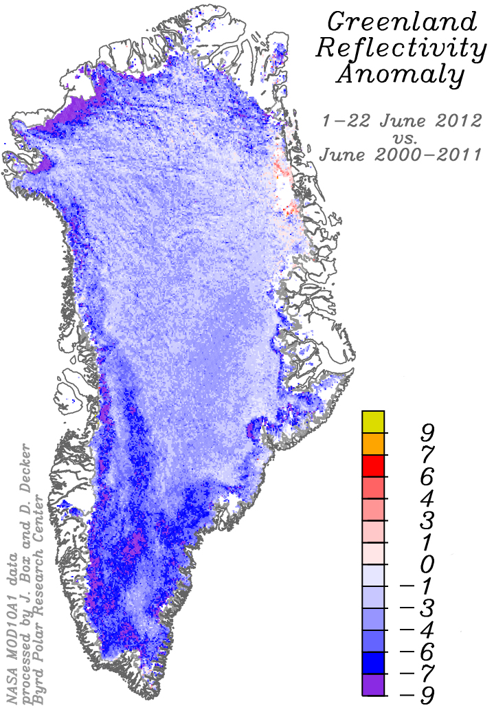 The map above shows the difference between the percent of sunlight Greenland reflected in the summer of 2012 and the average percent it reflected between 2000-2011. As you can see most of Greenland is in blue shades meaning less sunlight was reflected (more was absorbed) in 2012 compared with previous years.