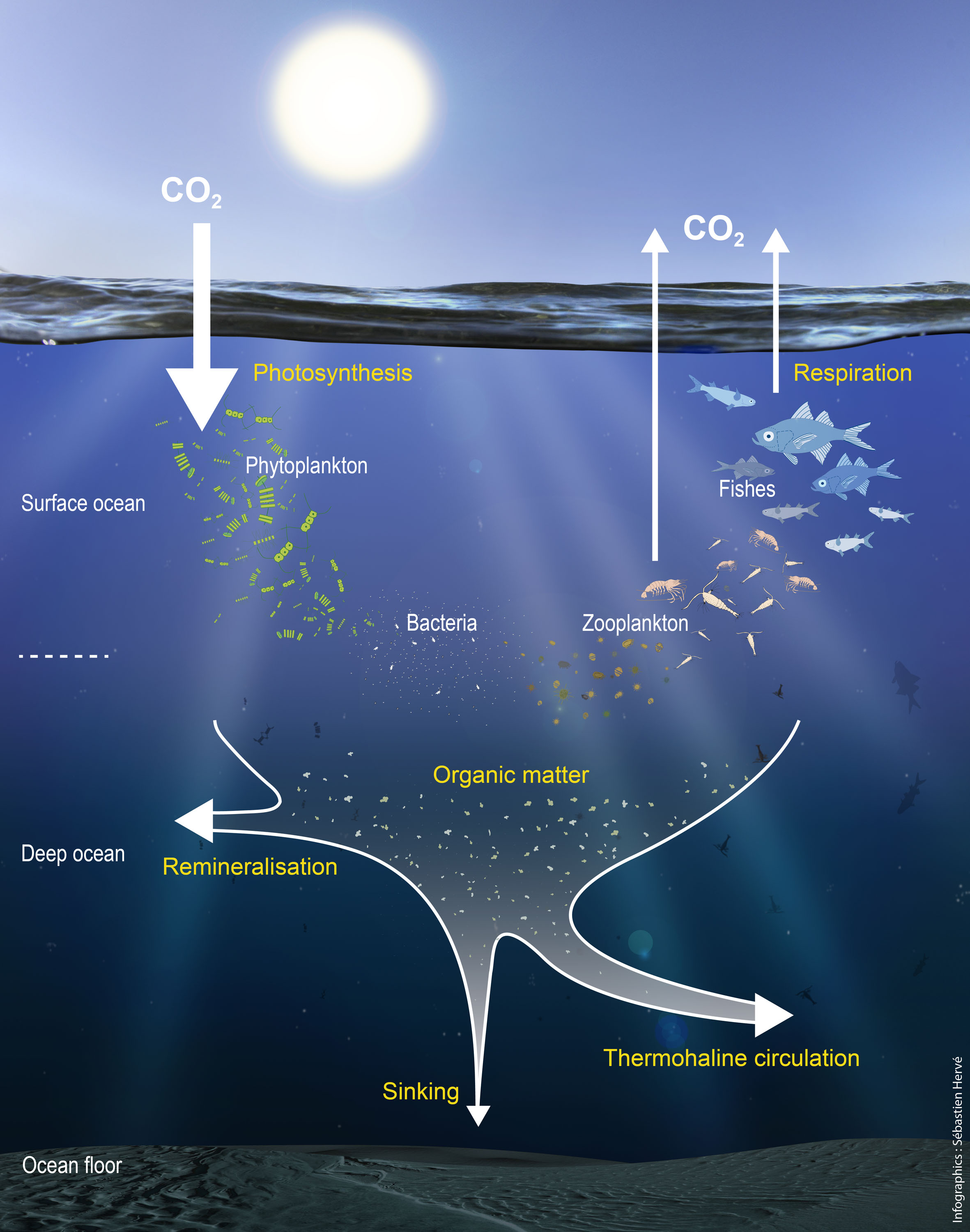 The higher concentrations of CO2 in the atmosphere can affect this oceanic biological sink to make it stronger or weaker. On one hand the warming can in some locations create higher rates of photosynthesis, meaning more growth and therefore a stronger sink. But on the other hand warming also increases respiration rates and from a certain threshold respiration would become more dominant which would weaken the sink.