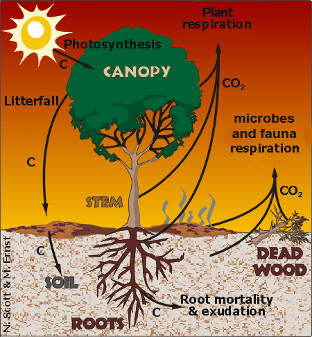 On the other hand some studies have shown that in the tropical forests along with greater growth of trees and bushes comes more litterfall and so more organic matter on the forests floor. This increased litterfall can increase carbon release due to "priming effect", as it provides easily decomposable organic matter which stimulates microbial activity and results in increase of CO2 emission from the soil.
