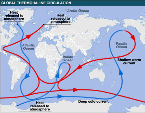 CO2 from the atmosphere dissolves in the ocean water. Basically the colder and more turbulent the water are the better CO2 is absorbed. Therefore most of the carbon intake takes place around the poles, in the north Atlantic ocean (which accounts for about 60% of this mechanism alone) and around Antarctica in the southern ocean, where cold surface water are sinking to the deep ocean as part of the Thermohaline Circulation (THC) also called the Ocean Conveyor Belt or the Meridional Overturning Circulation (MOC) – a system of surface and deep currents encompassing all ocean basins.