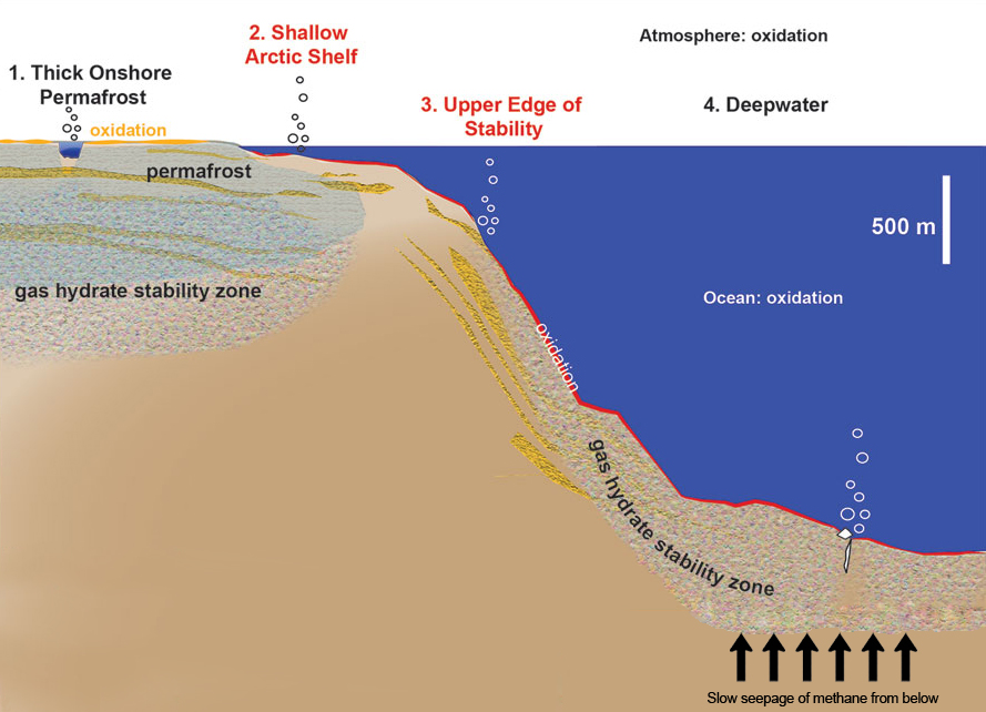 As mentioned before, there are deposits of 400 Gigaton in terrestrial permafrost soils but there is even a higher amount in subsea permafrost sediments. There are estimates of 2,500 Gigaton in methane hydrates in subsea permafrost sediment in the arctic area. These permafrost sediments are much less stable than the terrestrial ones (which have also began thawing) since they are covered with water with a temperature close to 0˚C since the end of the last glacial period and so are in a thawing process ever since, releasing methane to the overlaying water.