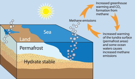 We mentioned the extinction event about 251 million years ago, called the Permian-Triassic extinction event, in which according to common scientific belief global warming caused by greenhouse gases ejected by a massive volcanic activity led to the disruption of the submerged methane hydrates reservoirs - causing massive volumes of methane to rise to the surface of the ocean in huge bubbles. Vast amount of methane was released into the atmosphere which caused more warming, and thus melting further hydrate reservoirs.