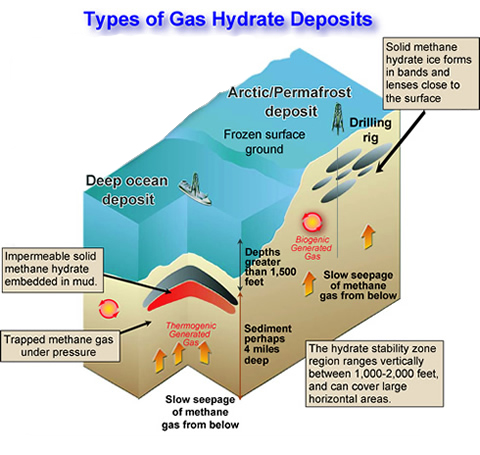 A bizarre but interesting lead comes from the energy industry. Since the energy locked up in methane hydrate deposits is more than twice the global reserves of all conventional gas, oil and coal deposits combined, the oil industry has been showing great interest in this substance. Ignoring repeated warnings by geologists regarding the unstable nature of the hydrates and the far reaching global affect they may drive, and despite there have already been incidents of oil drilling inadvertently triggering large releases of methane from hydrate deposits, the oil corporations keep exploring ways of utilizing the hydrate's energy for human consumption.