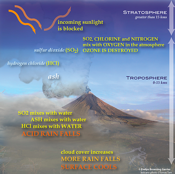 Sulfur dioxide (SO2) is one of the two most significant components of Ultra Plinian eruptions, and of the varied other gases that make up the eruption, it causes the strongest immediate effect on the environment (as opposed to CO2 which causes a very strong effect in the long run). Sulfur dioxide reacts with oxygen and water to produce tiny droplets of sulfuric acid (H2SO4) which condense rapidly in the stratosphere and reflect sunlight directly back into space. Stratospheric winds spread the sulfuric acid particles until they practically cover the globe, where they can linger for a couple of years. By reflecting the sunlight, they reduce the amount of energy reaching the earth's surface and so it is getting significantly cooler.