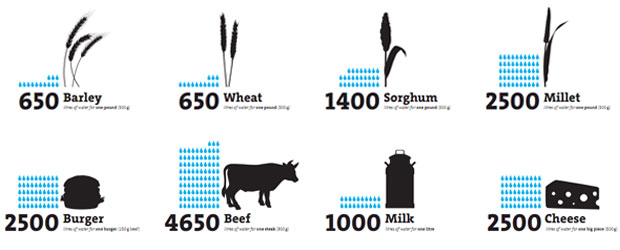 • The production of one kilo of cows’ flesh takes almost 8 times more water than the production of a kilo of Soya beans or rice.
